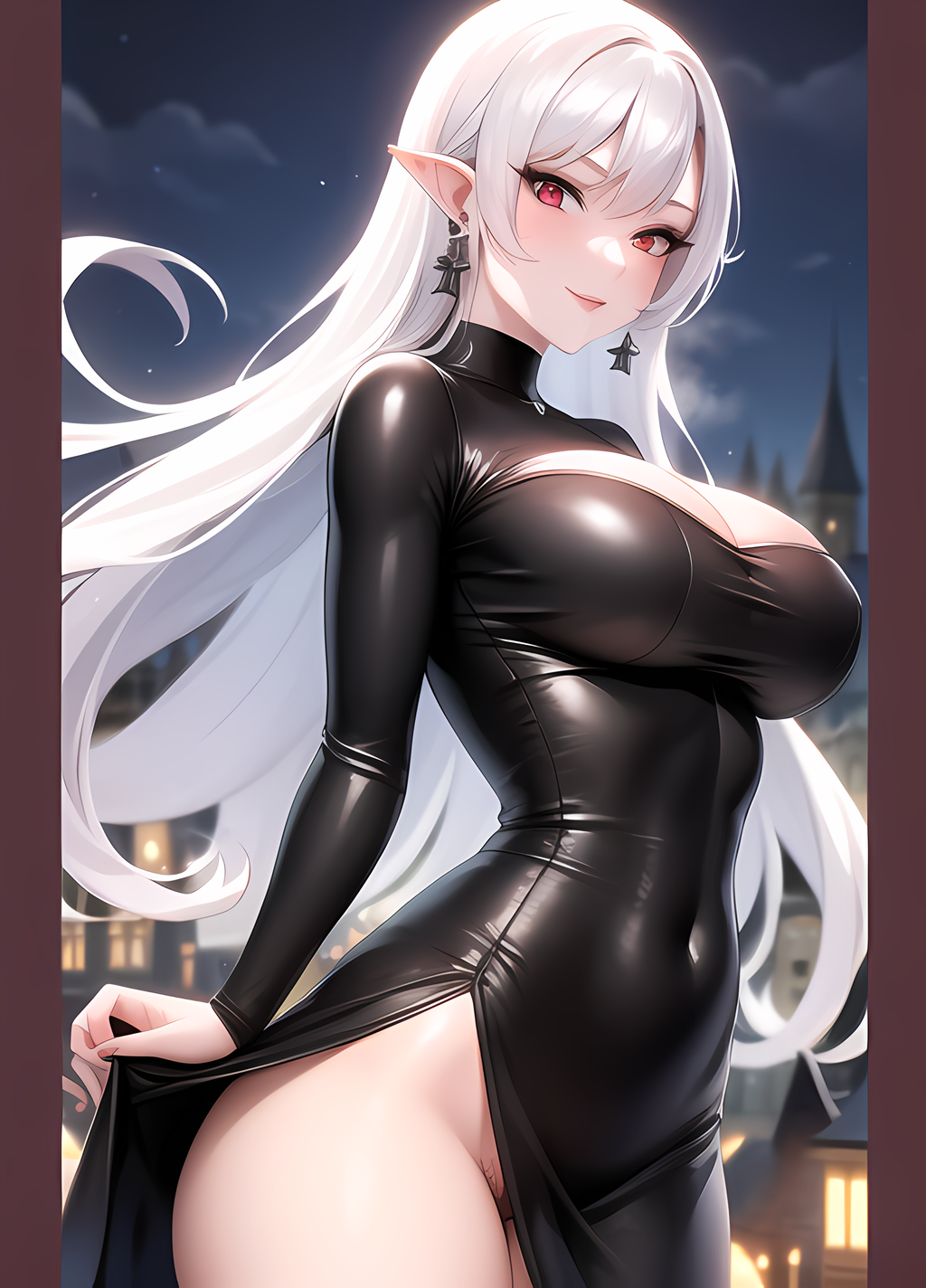 Tags: ai generatedaiwildlyblack dressbreastsdressimageboardlong hairlooking at viewernai diffusionoriginaloriginal characterpale skinpussypussy peekred eyesRule34skin tightvampirewhite hair