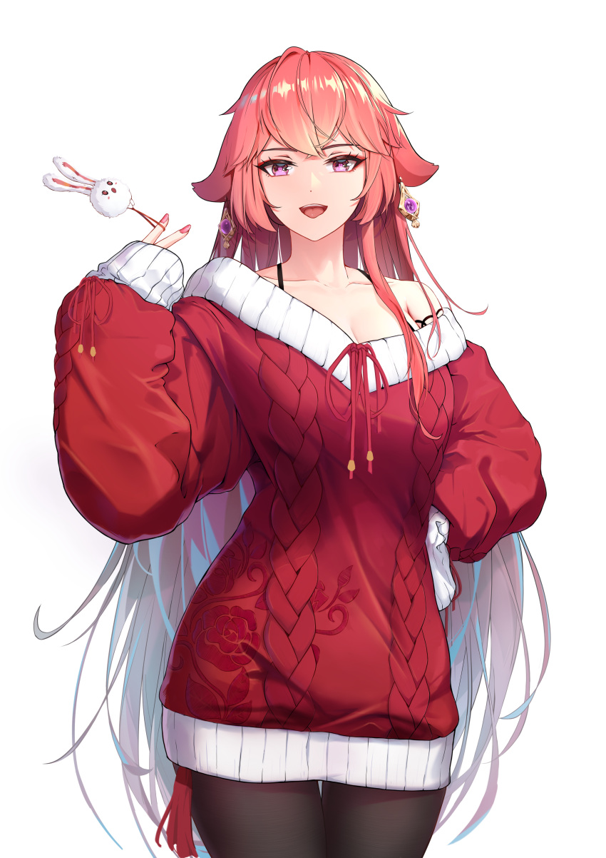 Tags: 1girlsanimal earschentc101cleavagecollarboneconfidentcutedressearringsfemalefemale onlygenshin impacthand on hiphighresimageboardlegwearlight-skinned femalelong hairlooking at viewermagenta eyesnail polishnailsopen mouthpantyhosepeace signpink hairRule34smilesolostandingsweatersweater dressvv signvery long hairwhite backgroundyae miko
