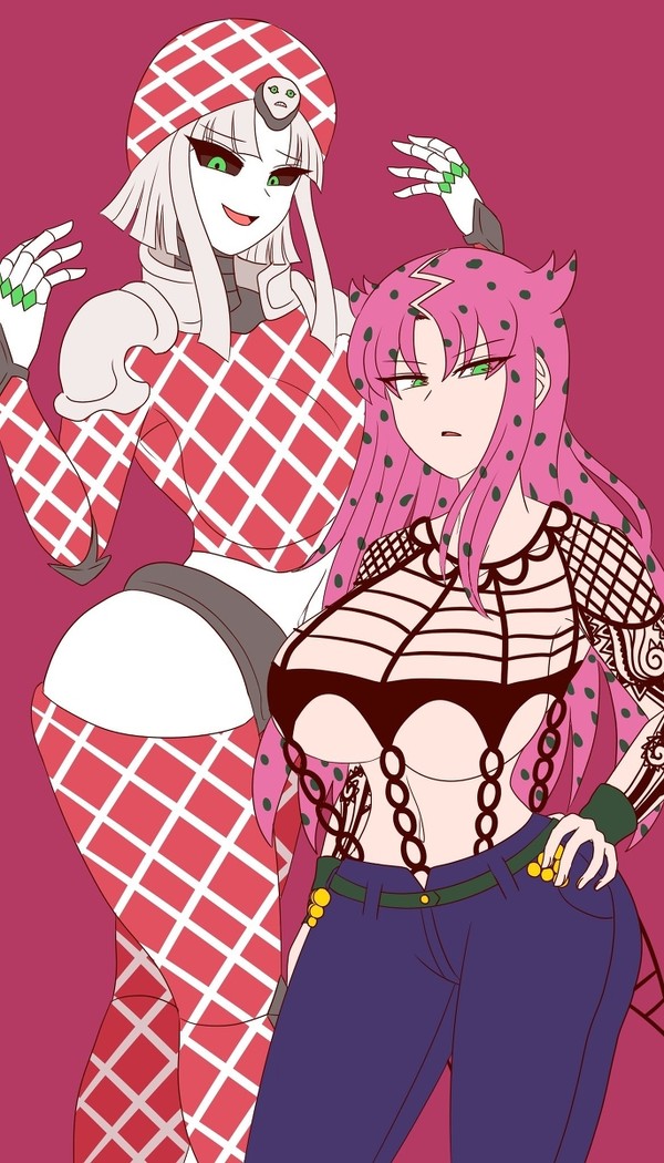 Tags: 2girlsbig breastsblack scleracleavagediavoloepitaph (jjba)femalefishnet shirtfishnetsgreen eyeshathumanoidimageboardjojo's bizarre adventureking crimsonpink hairposerevealing clothesrule 63Rule34simple backgroundstand (jjba)vento aureowhite bodywhite hairwhite skinwide hips