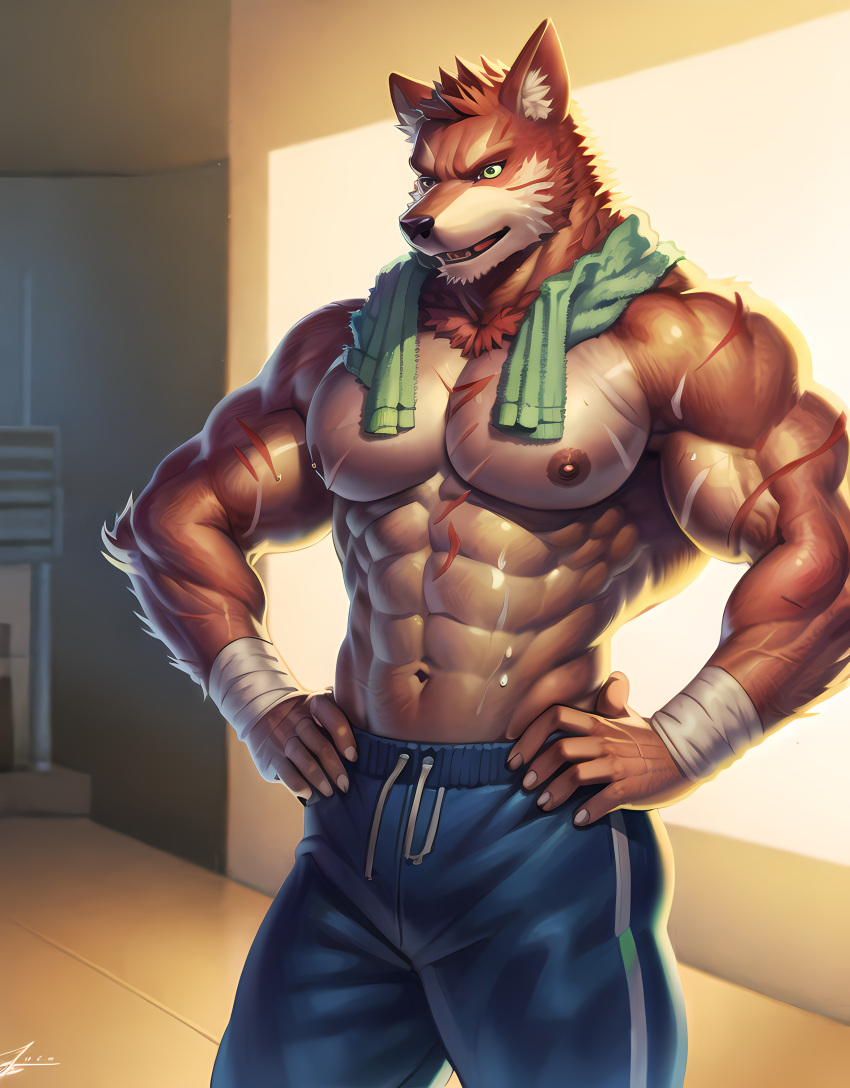 Tags: 1boyabsai generatedanimal earsanthrobandagesbarachest hairdog earsfurryfurry malegreen eyeshands on hipsimageboardlarge pectoralslooking at viewermale focusmuscularmuscular malenavelnipplespantspectoralsRule34scarsolostable diffusionstomachthick eyebrowsthick thighsthighstopless maletoweltowel around necktrack pantswolf ears