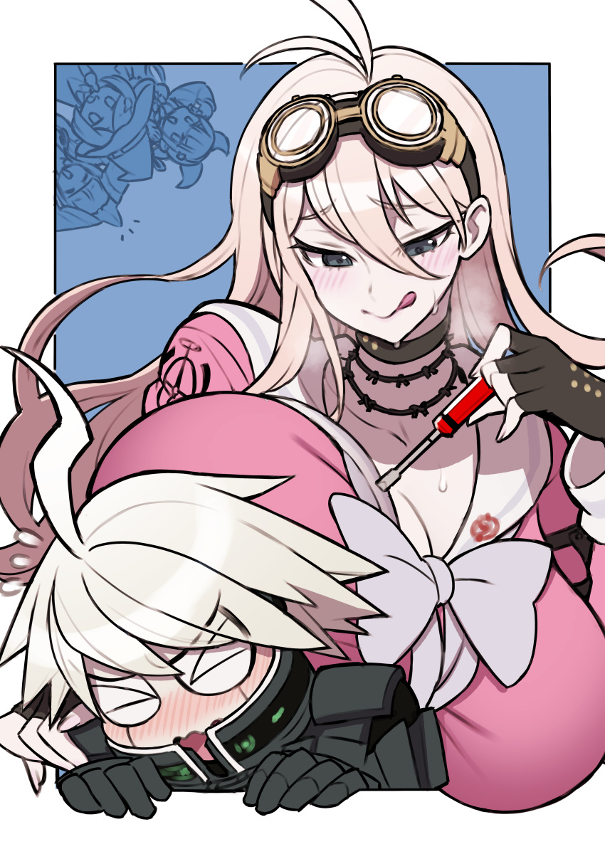 Tags: 1boy1girlsahogebackground characterblonde hairblue eyesblushbowbreast squishbreastsbreasts bigger than headbreasts on headchokercleavagedanganronpadanganronpa v3embarrassedfemaleglovesgoggleshair between eyeshuge breastsimageboardiruma miukiibolarge breastslong hairmalenaughty facenew danganronpa v3robotRule34satousatotototoschool uniformscrewdriversweattonguetongue outwhite hair