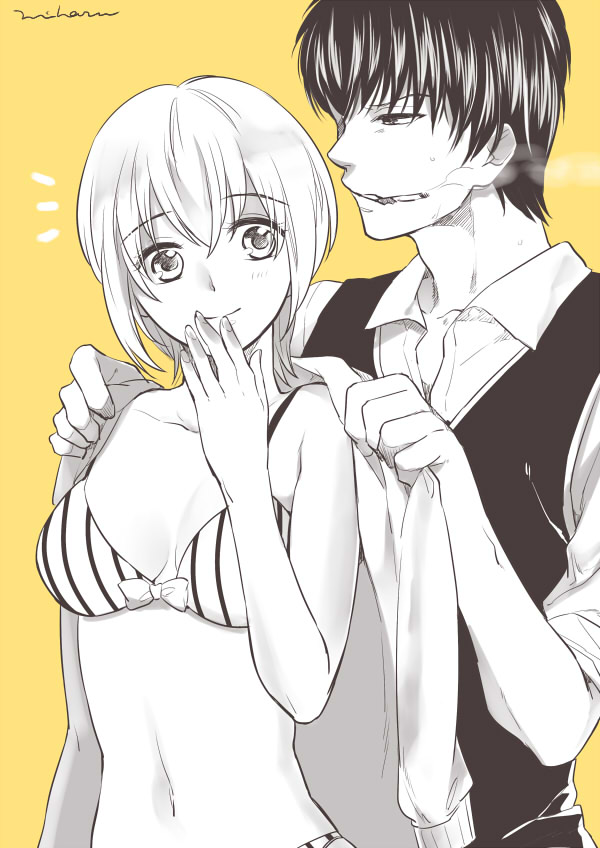 Tags: 1boy1girlsbikinicigarettecleavagecovering upembarrassedfemalegintamahijikata toshiroimageboardlooking at anothermalemedium breastsmiharu dtokita mitsubaRule34short hairsmilesmokingstriped bikinisweaterswimsuituncomfortablewholesomeyellow background