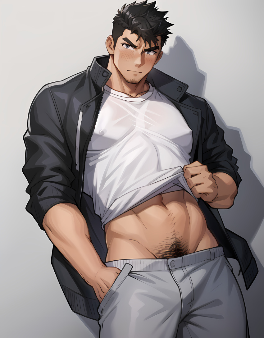 Tags: 1boy2023absai generatedbarablack hairblack jacketblushbulgeclothes liftcovered nipplesfacial hairimageboardjacketlarge pectoralslifted by selflooking at viewermalemale focusmale onlymale pubic hairmature malemuscularmuscular malenavelnavel hairopen clothesopen jacketpantspectoralspubic hairRule34see-throughshirtshirt liftshort hairsideburnssole malesolosolo malestable diffusionstubblewhite shirt