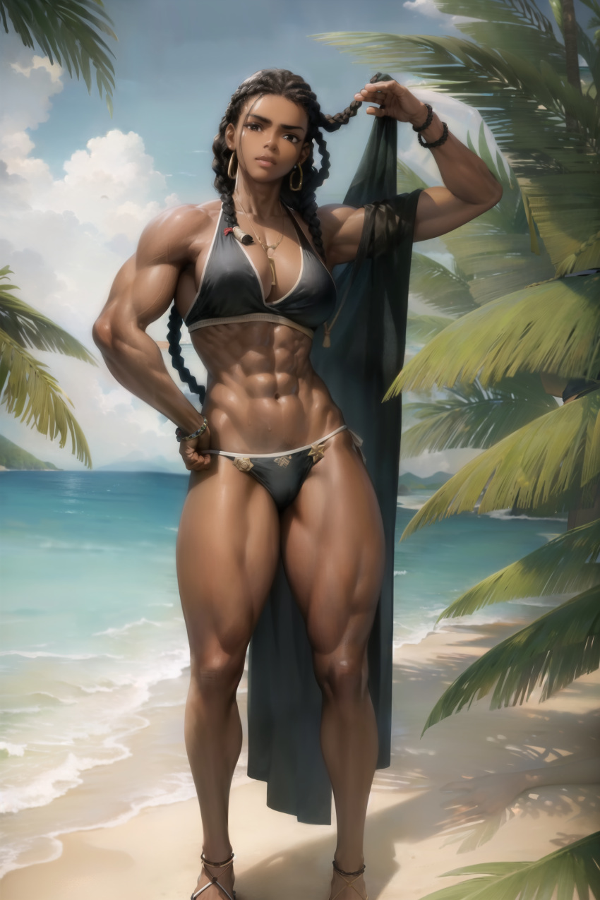 Tags: absai generatedbeachbikiniblack bikiniblack hairbraidbraided hairbreastsbrown eyesdark skindark-skinned femalefemalehand on hiphighreshoop earringsimageboardmedium breastsmuscularmuscular femalemuscular thighsnecklaceoutdoorspubic hair peekRule34sandalsstable diffusion