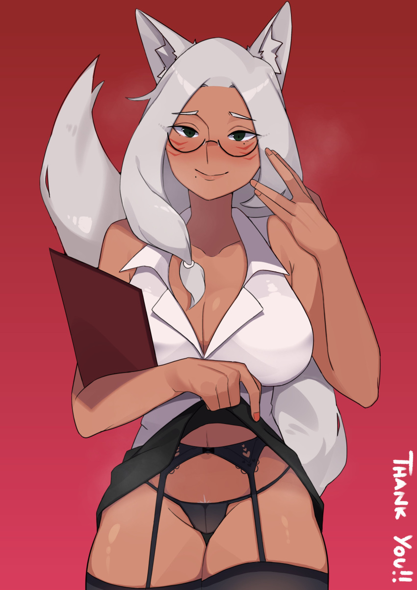 Tags: 1girlsblack eyesblack pantyhoseblack skirtblushbustyclipboardfox earsglassesimageboardlifting skirtmole under mouthoriginal characterRule34shirt opensmileteasingteasing viewerwhite furwhite hairwhite tail