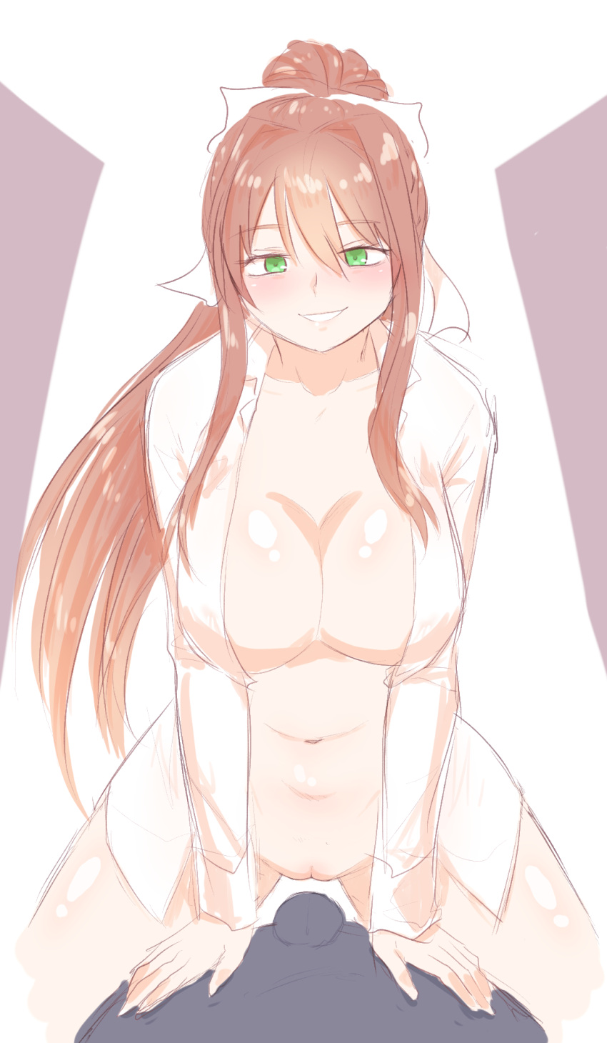 Tags: anonblack bodyblack skinbowbrown hairdark skindoki doki literature clubgreen eyesimageboardknk (artist)monika (doki doki literature club)ponytailRule34shirtsmilesmilingsmiling at viewerwhite bowwhite shirt