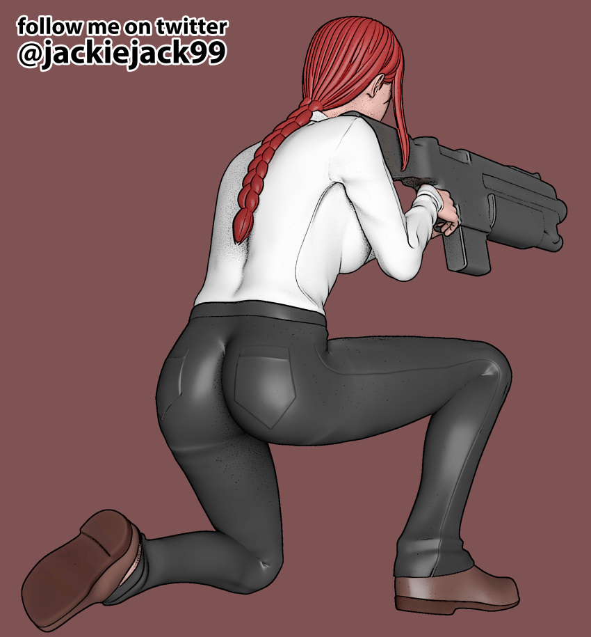 Tags: 1girlsassass focusback viewchainsaw mancrouchinggoddess of victory: nikkegunimageboardjackiejack99makima (chainsaw man)red hairRule34shootingsimple backgrounduniform