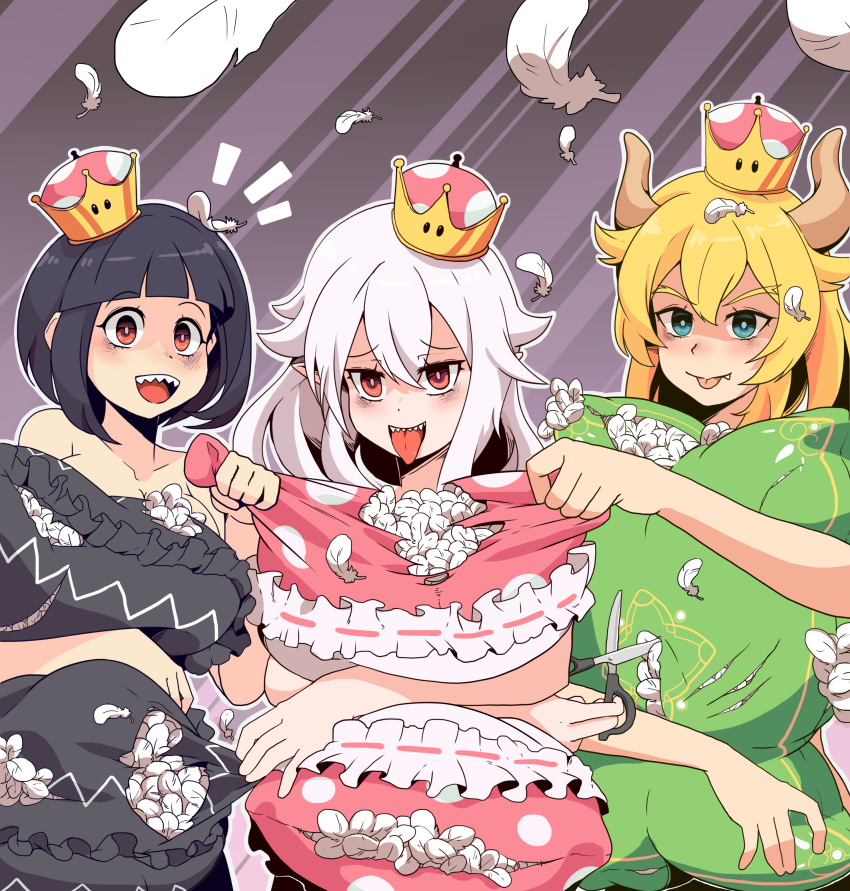 Tags: boosettebowsettechain chompchompettecrowndiana908feathersimageboardlong hairmario (series)new super mario bros. u deluxepillowpillow fightpillow hugRule34scissorsshort hairsleepoverslumber partysuper crowntorn pillow