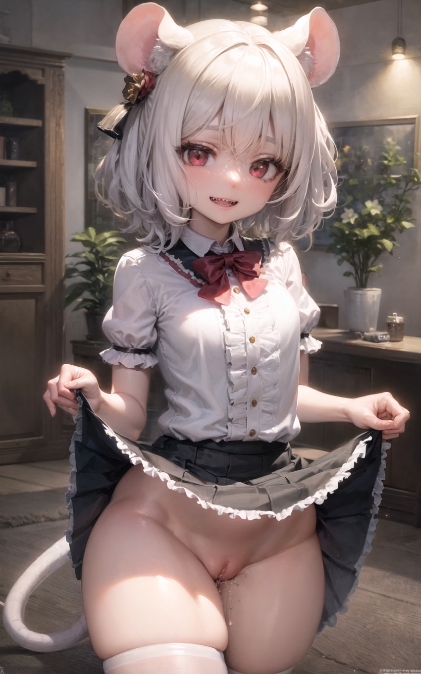 Tags: 1girlsai generatedanimal earsblushcameltoecleft of venusclothingfemale onlyimageboardlooking at viewermouseopen mouthpresentingpussy juicered eyesRule34sharp teethshort hairskirt liftsmilestable diffusionstockingstailthick thighswhite hairwide hips