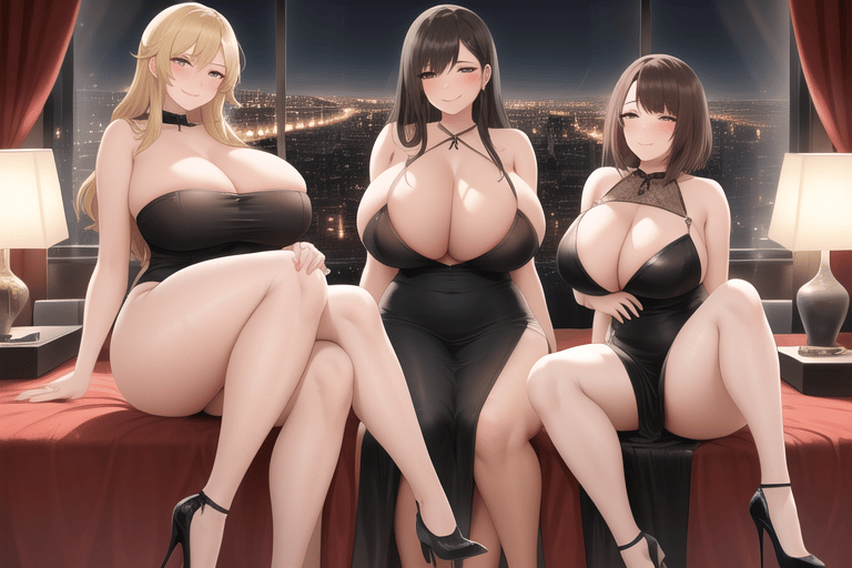 Tags: 3girlsai generatedblack dressblonde hairbrown haircrossed legshigh heelshotel roomhuge breastsimageboardoriginal characterRule34seductive smilethick thighsthird leg