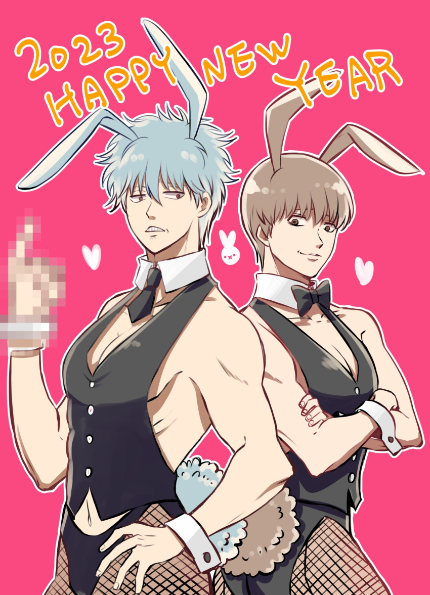 Tags: 20232boysalternate costumeangrybowtiebrown hairbunny boybunny earsbunny tailbunnysuitcrossed armsfake animal earsfishnetsfully clothedgintamagintoki sakatahand on hipimageboarding srlight blue hairlight brown hairlooking at anotherlooking at viewermalemale onlymiddle fingermosaic censoringnew yearokita sougopink backgroundRule34tonedtoned malevestwrist cuffsyear of the rabbit