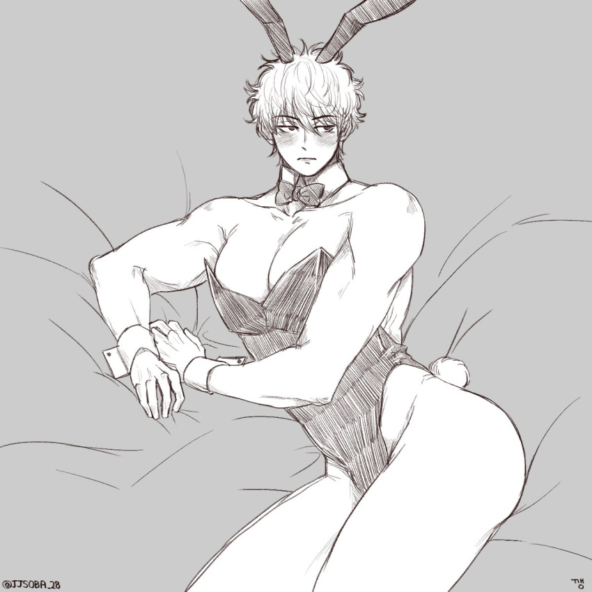 Tags: alternate costumeblushbowtiebunny boybunny earsbunny tailbunnysuitcleavagecrossdressingcurly hairdetached collarexpressionlessgintamagintoki sakataimageboardkkae kkaenglooking awaymalemale onlymonochromemuscularmuscular maleon bedon sidepecsRule34solowrist cuffs