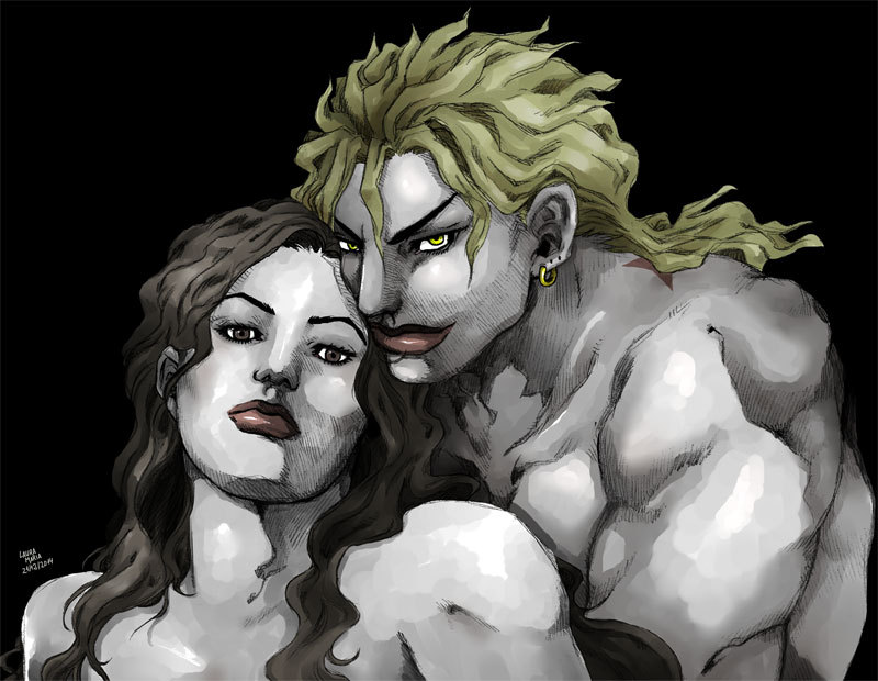 Tags: 1boy1girlsbirthmarkblack backgroundblonde hairbrown hairclosed mouthdio brandofemalegiorno's momimageboardjoestar birthmarkjojo's bizarre adventurelong hairlooking at viewermalemuscularmuscular malenudered lipsRule34smilestraightvento aureoyellow eyes