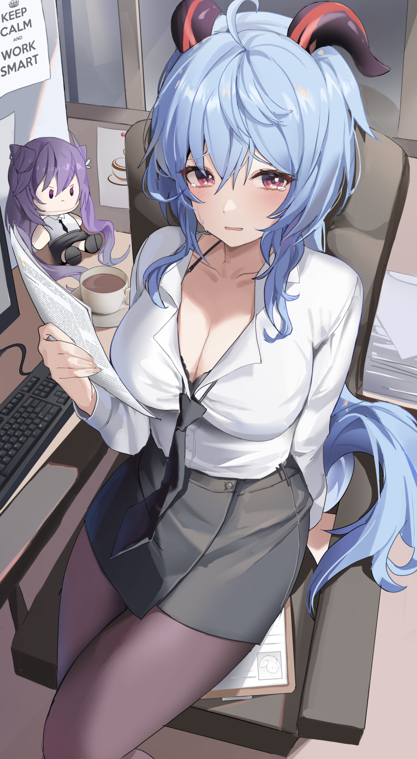 Tags: 1girlsbangsblue hairbustycoffee mugcurvy figureformal attireganyu (genshin impact)genshin impacthornsimageboardkeyboardlight blue hairlight-skinned femalelong hairmungducknecktienewspaperofficepantyhoseplushieRule34sittingskirtsolosolo femalesolo focussubmissivesubmissive femalesubmissive pov