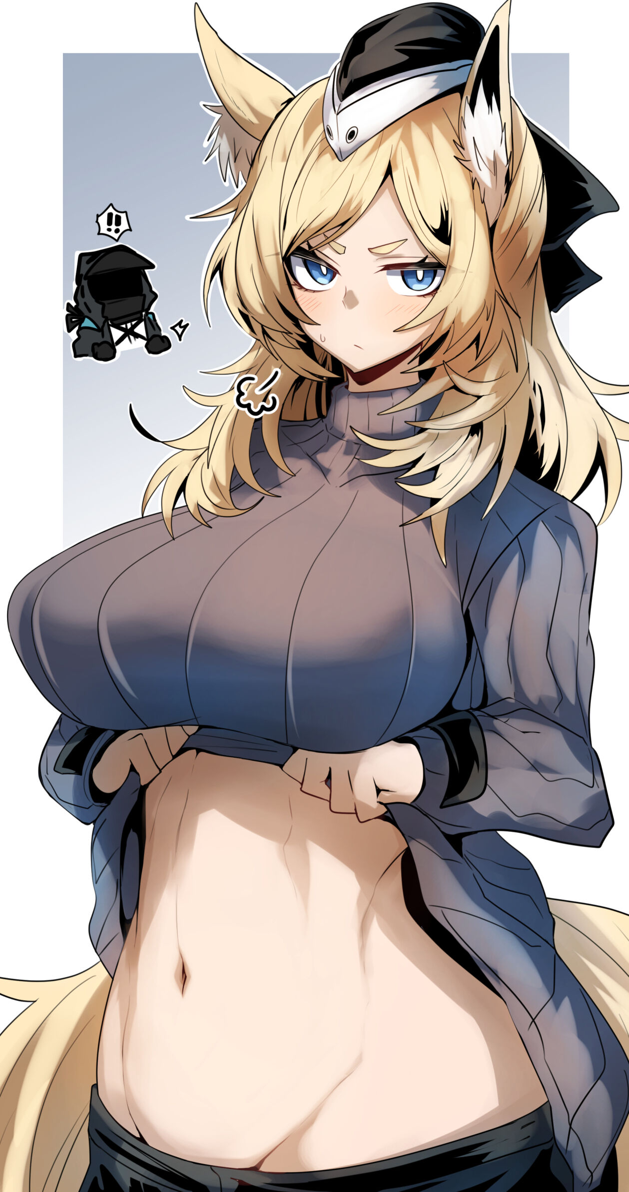 Tags: 1girls2023animal ear fluffanimal earsarknightsbellybelly buttonbig breastsblonde hairblue eyesbreastscleavagegin mokuhathi reshorse earshorse tailimageboardlight skinlight-skinned femalelong hairRule34simple backgroundsolostandingsweatersweater lifttailwhislash (arknights)