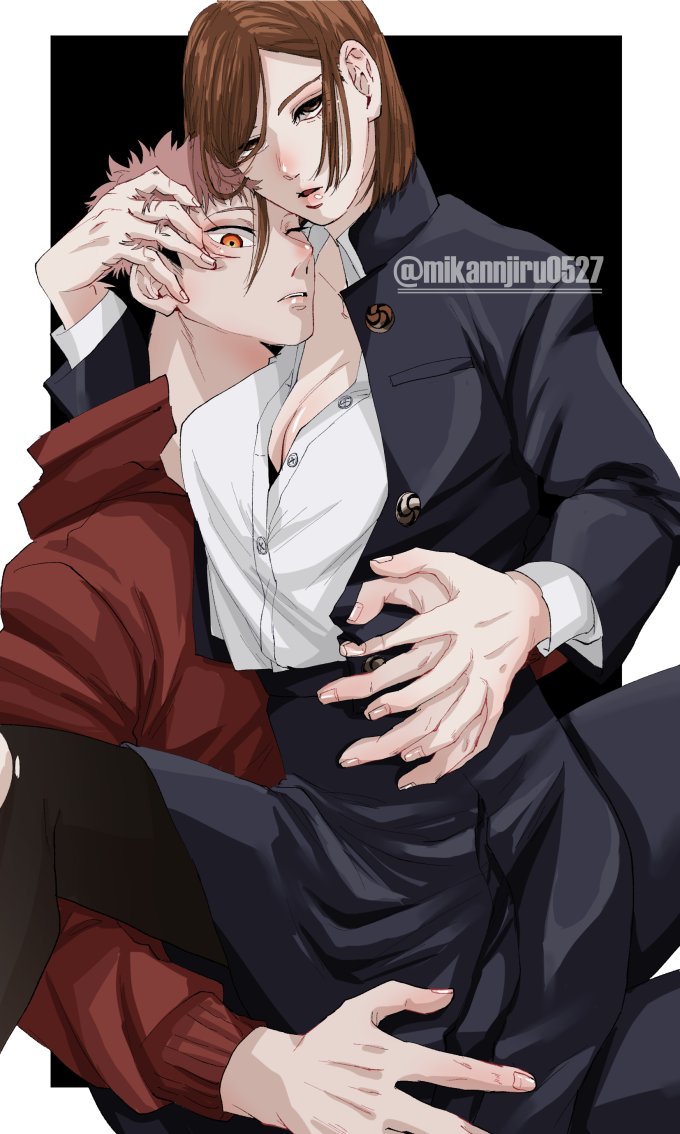 Tags: 1boy1girlsarm around partnerarm around waistarms around partnercleavagefemalehand in hairhand on another's headhand on facehand on handhand on headhand on waisthuggingimageboarditadori yuujijujutsu kaisenkugisaki nobaramaleon lapopen clothesRule34sitting on lapuniform