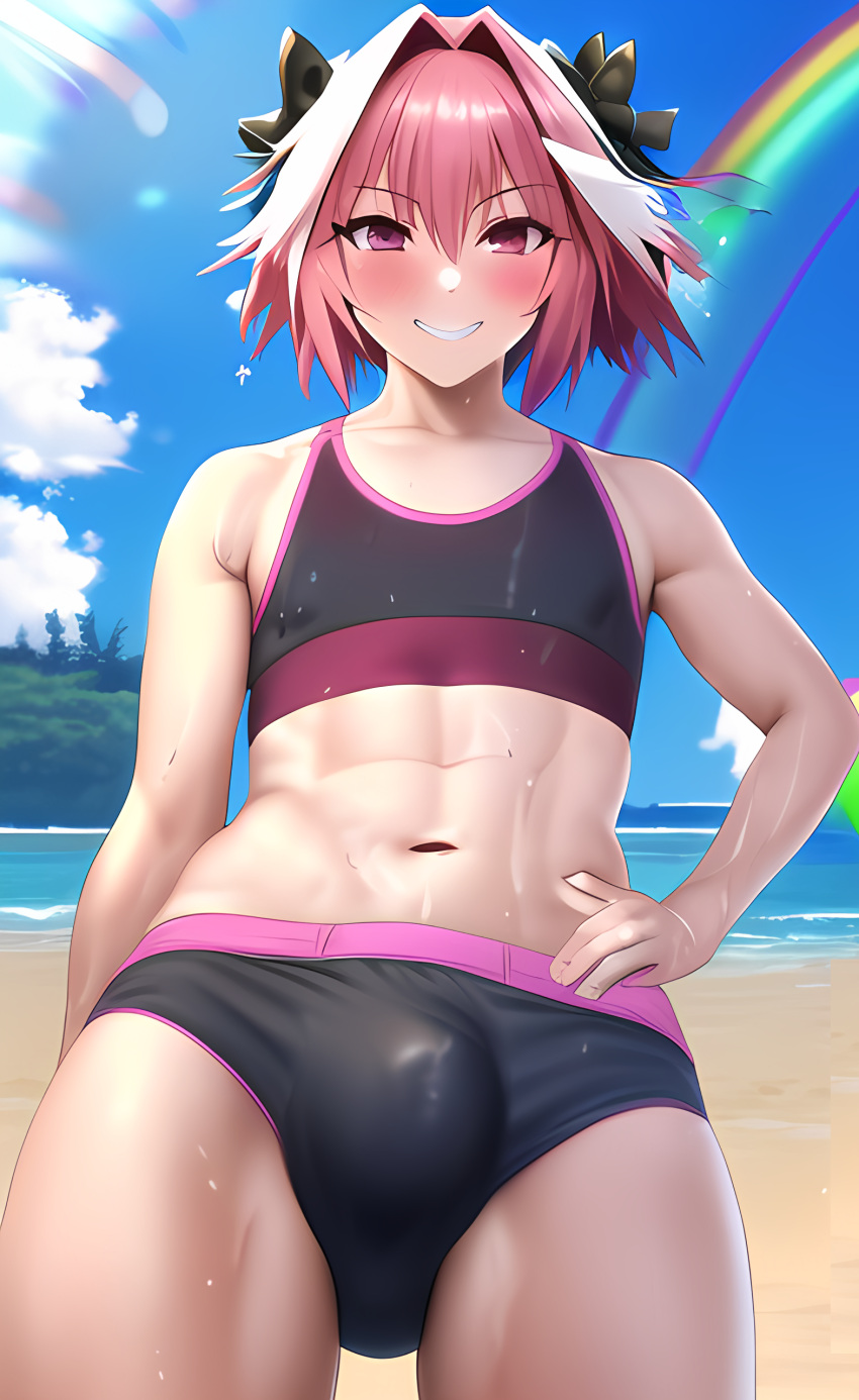 Tags: ai generatedastolfo (fate)beachbelly buttonbulgebulge through clothingcrop topfemboygirlyhand on hipimageboardnovelaipantiespink eyespink hairrainbowRule34smilesmilingsmiling at viewerwetwet bodywet clothes