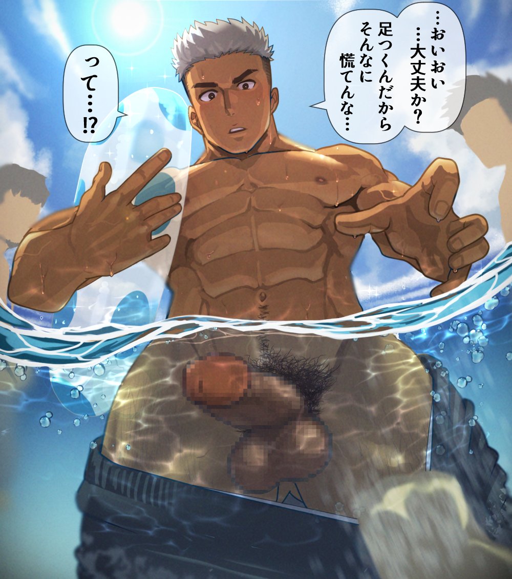 Tags: 1boyabsballsbelow viewdialoguefloatiefuna (artist)imageboardjapanese textmalemale focusmale onlymuscular malepecspovpubic hairpulling down pantspulling down shortsRule34solostanding in waterswimming trunksswimweartesticlestexttext bubbletranslation requesttwo tone hairundercutunderwater viewwhite hair