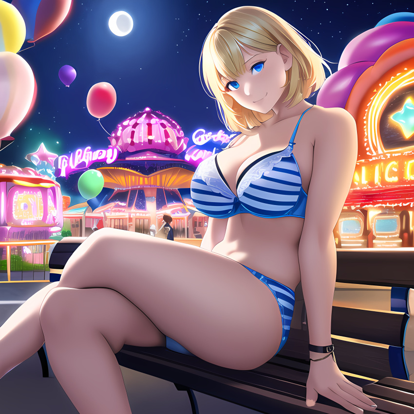 Tags: ai generatedamusement parkashley grahamballoonbenchbig breastsblonde hairblue eyesbracrossed legscurvaceouscurvycurvy bodycurvy femalecurvy figureimageboardlarge breastsmedium hairnightnovelairesident evil 4Rule34sittingsmilesmilingsmiling at viewerstriped brastriped panties