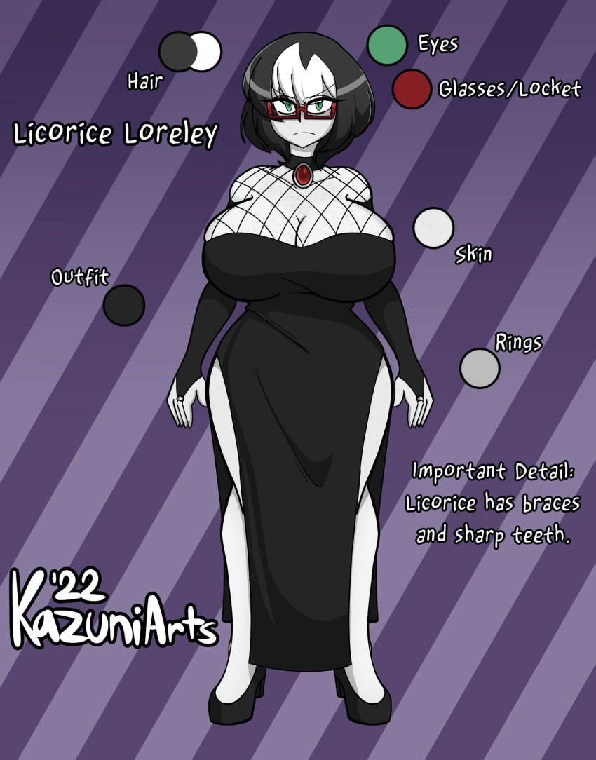 Tags: big breastsblack hairbreastsglassesgothgreen eyesheelsimageboardkazuniartslicorice loreley(kazuniarts)looking at viewerred glassesRule34short hairthighstwo tone hairvoluptuouswhite hairwitch