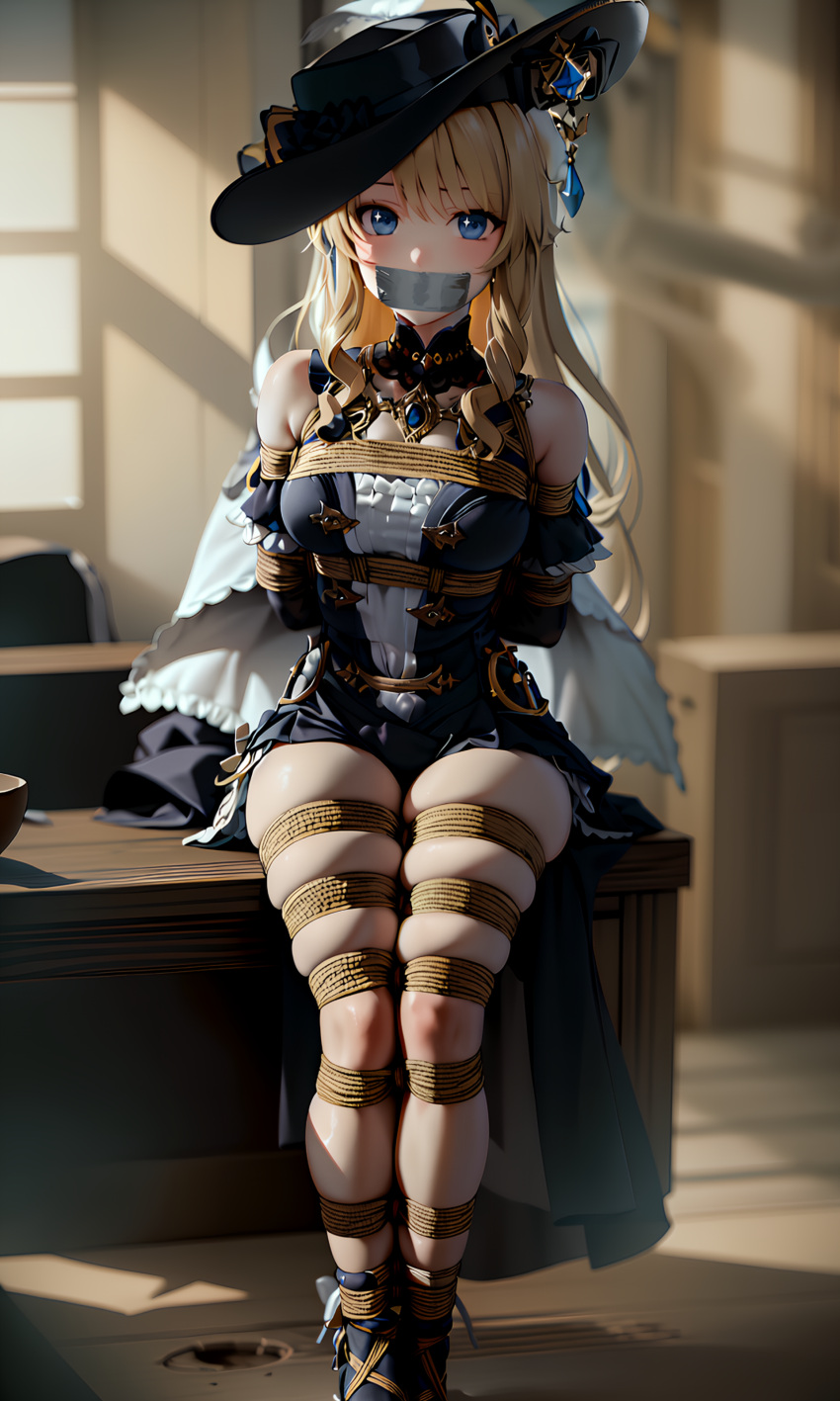 Tags: ai generatedarms tied behind backblonde hairblue eyesbondagebound anklesbound legsfemalefemale onlygaggaggedgenshin impacthatimageboardlooking at viewernavia (genshin impact)Rule34sittingtape gagwoman