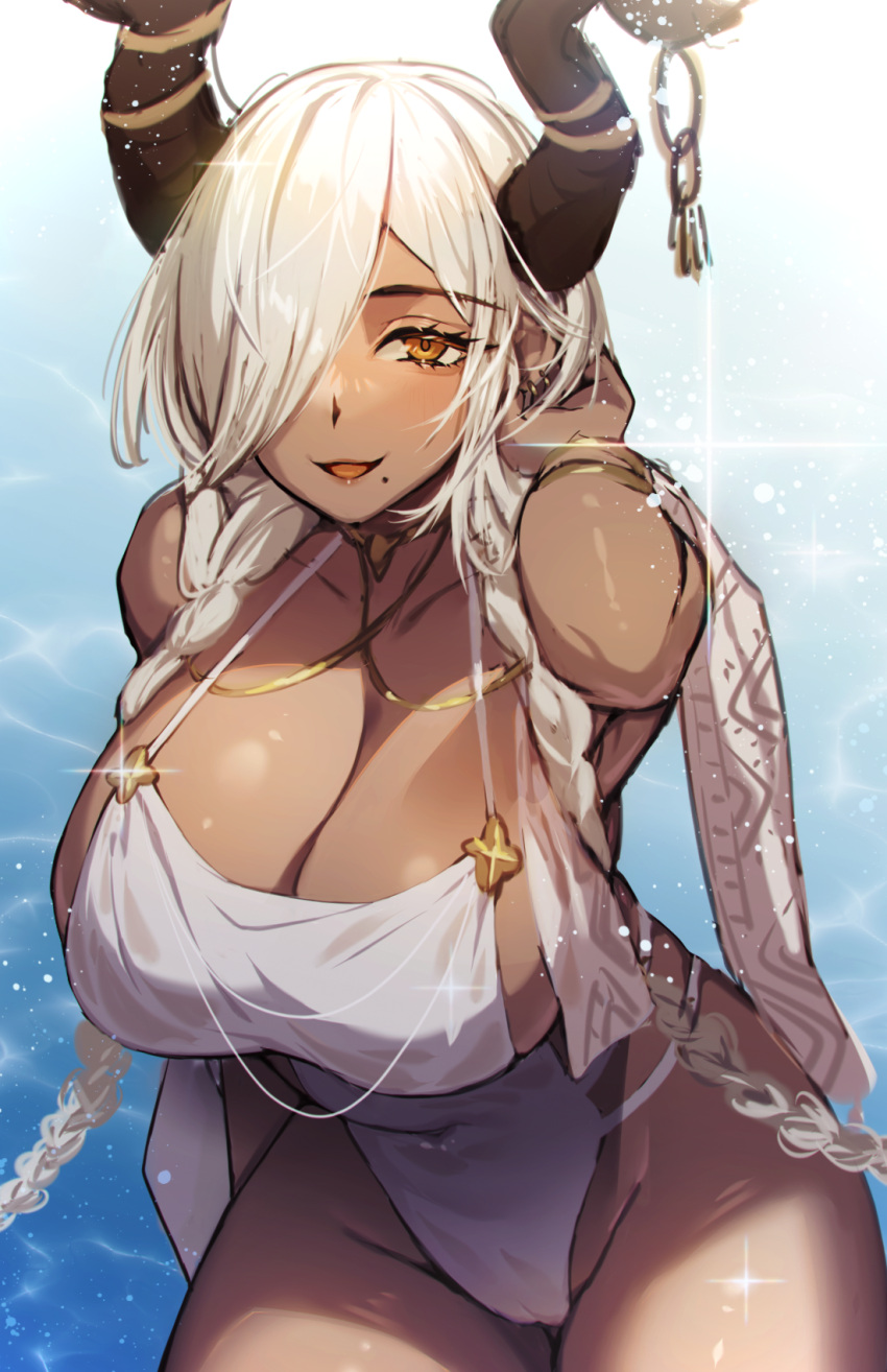Tags: arm behind headasymmetrical bangsazur lanebraceletbraidbreastsbrown hornscameltoecovered naveldark skindark-skinned femaleearringsfemalehair over one eyehighleghighleg swimsuithighreshorn ornamenthornsimageboardjewelrylarge breastslong bangslong hairlooking at viewerlow twin braidsmaitei roppamolemole under mouthnecklaceone eye coveredone-piece swimsuitopen mouthorange eyesowari (azur lane)owari (shimmering forsythia) (azur lane)revealing clothesRule34smilesoloswimsuittwin braidsvery long hairwaterwhite hairwhite one-piece swimsuit
