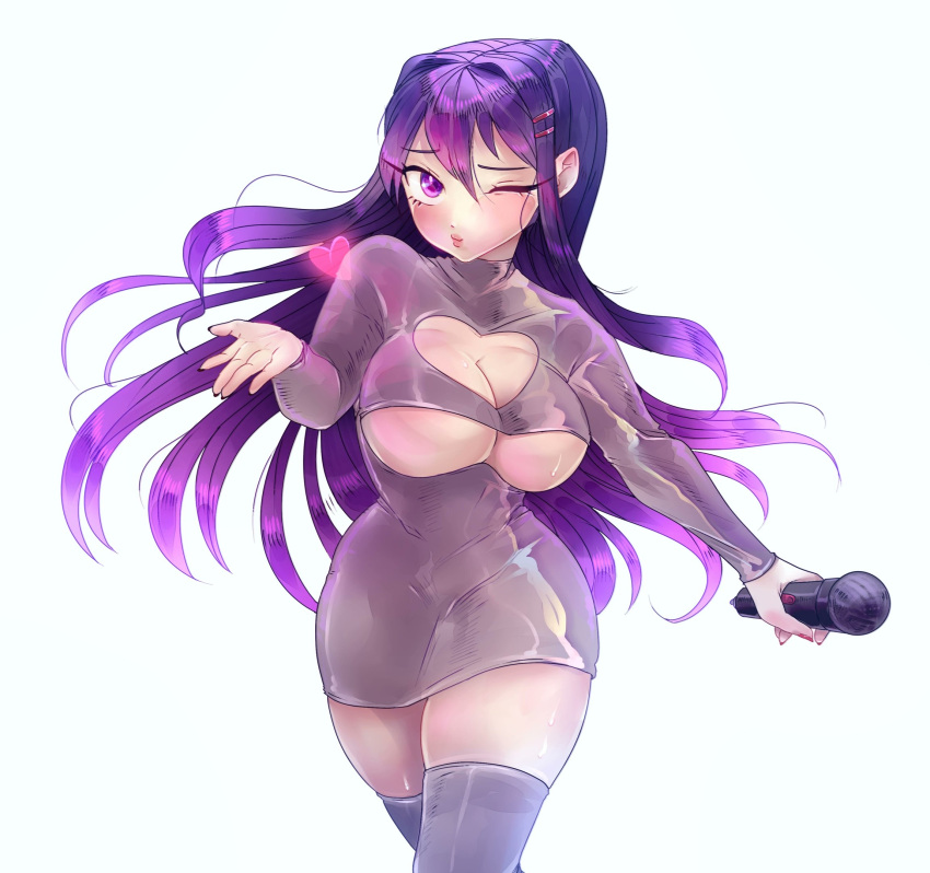 Tags: blowing kissblushbreasts almost outchenchensimp (artist)doki doki literature clubgray clothesgray thighhighshaircliphand outheartholding microphoneholding objectimageboardlong hairlooking at viewermicmicrophoneone eye closedpink heartpurple eyespurple hairRule34solothighhighswinkwinkingwinking at vieweryuri (doki doki literature club)