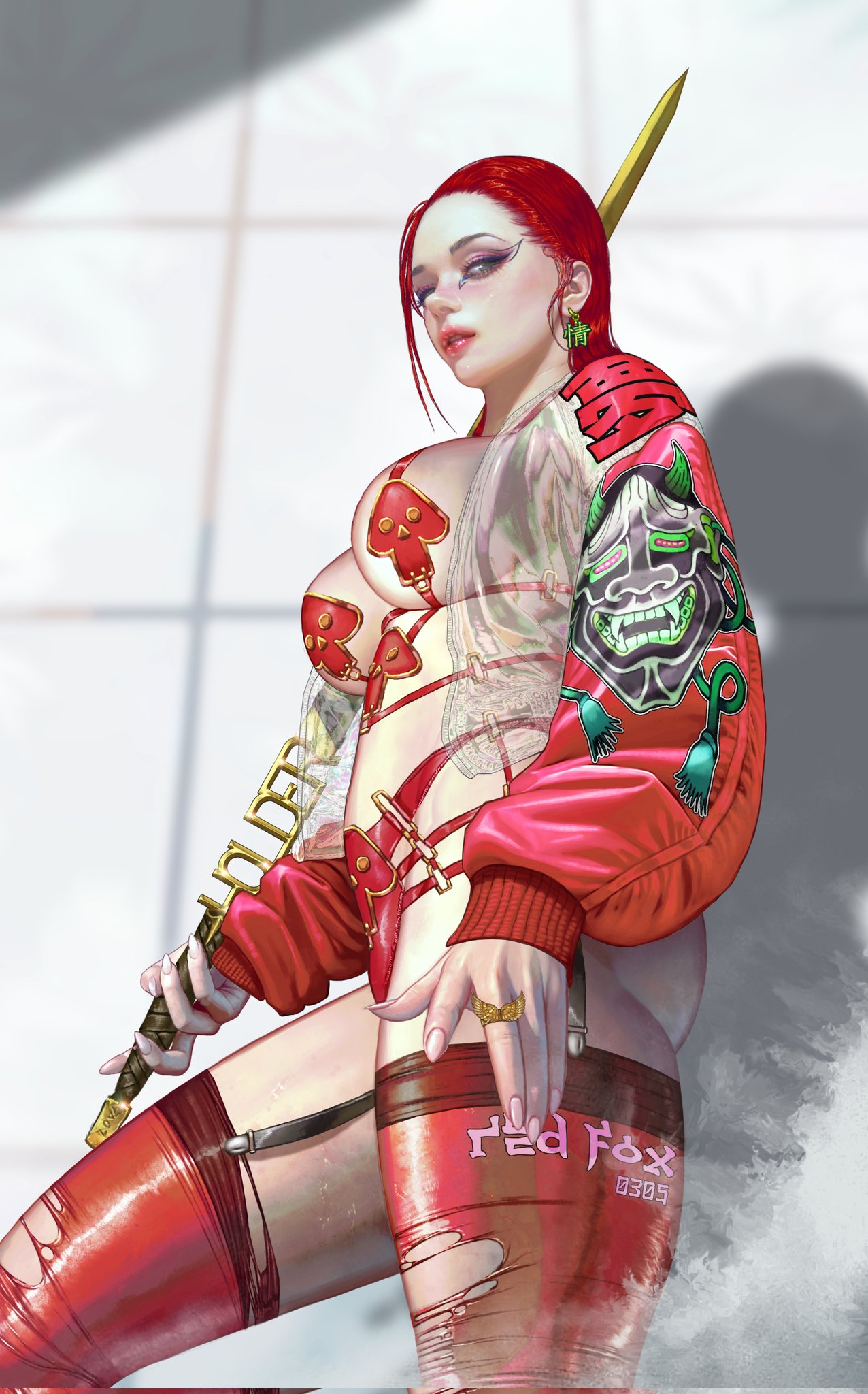 Tags: big breastsbraimageboardjacketjacket openkyuyong eomleather pantsleather topwearred hairripped clothingripped pantyhoseripped thighhighsRule34thighstight clothingtightstransparent clothing