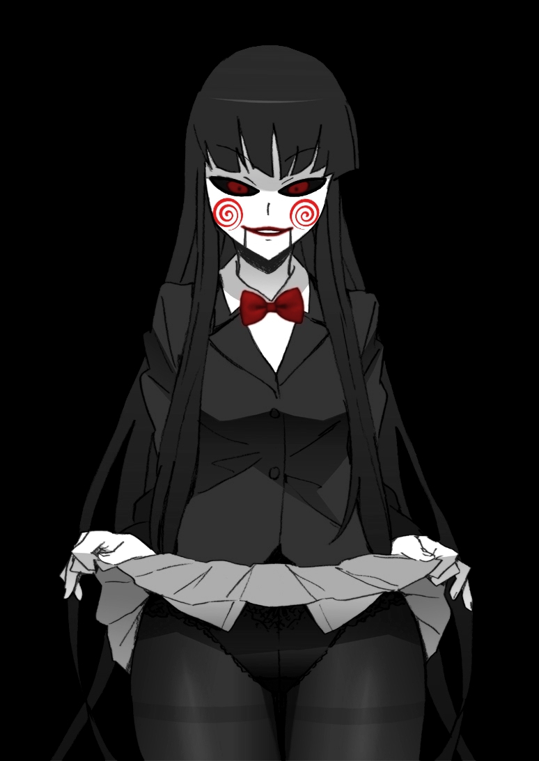 Tags: 1girlsanime nosebangsbilly the puppetblack bodyblack dressblack hairblack pantyhoseblack underwearbowtieclothingdresseyebrows visible through hairfemalefemale onlygenderswap (mtf)imageboardlong hairlooking at viewernightmare waifupantyhosepuppetrule 63Rule34saw (series)simple backgroundunderwear