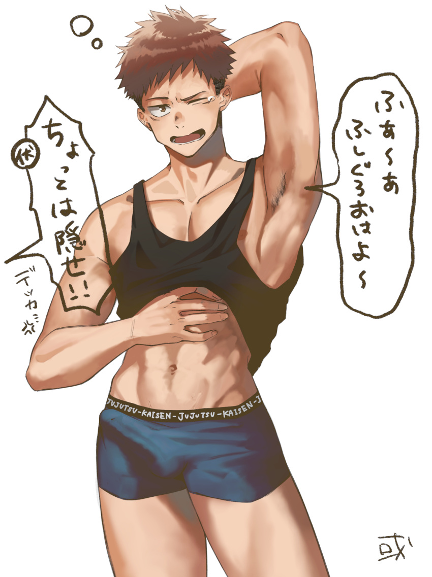 Tags: 1boyarmpit fetisharmpit hairarmpitsarurun1231bonerbulge through clothinggayimageboarditadori yuujijujutsu kaisenmalemale onlymusclesmuscularmuscular malered hairRule34soloteen boyteenagerunderwearyaoiyawn