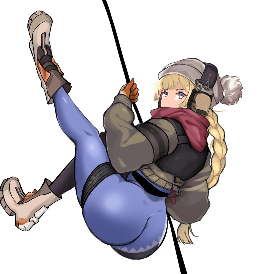 Tags: absurdresassbackblonde hairblue eyesbootsbraidbraided ponytailbrown jacketclosed mouthfemalegirls' frontlineglovesgrey headwearheadphoneshighresholdingholding ropeimageboardjacketleggingslegslegs uplong hairlooking at viewerloveuofficial alternate costumeorange glovesred scarfropeRule34scarfsolospandexthighsvhs (girls' frontline)vhs (keeper on page 8) (girls' frontline)white background