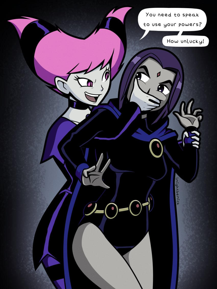 Tags: dc comicsenglish textfemdomfemsubhand gaghand gaggedhand over another's mouthheld from behindimageboardimightbemickjinx (dc)looking at anotherpink eyespink hairpurple eyespurple hairraven (dc)Rule34tagmeteen titans