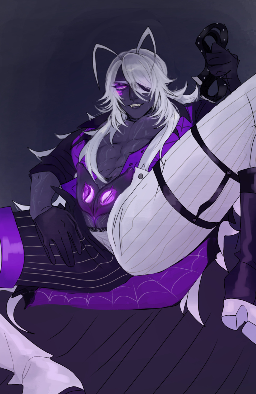 Tags: 1boyabsanimal genitaliabeltdiphalliadiphallismfangsgenital slitgenitalsglowing eyesglowing genitaliaimageboardlong hairlooking at viewerlooking downmonster boymulti eyemulti penispecspenispsychopompoipurple bodyRule34sadistic smilesharp teethspiderspread legssuitundressingwhite hair