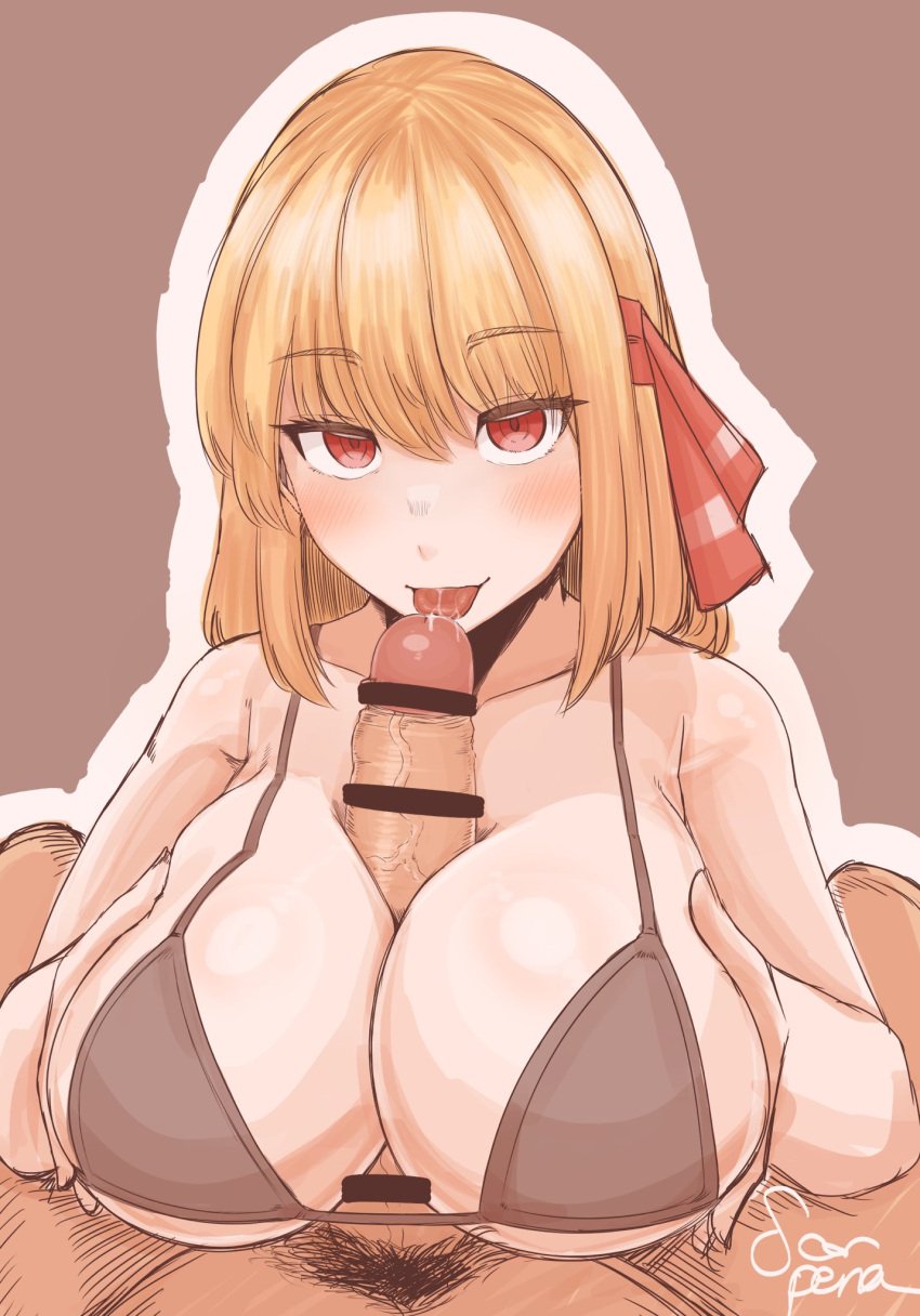 Rule 34 – 1boy banned artist belko bikini bikini top black bikini black bikini top blonde gyaru (belko) blonde hair breasts censored clip collarbone female grin grinning at viewer hair over one eye highres large breasts nail polish orange eyes original original character paizuri short hair straight swimsuit | 10154837