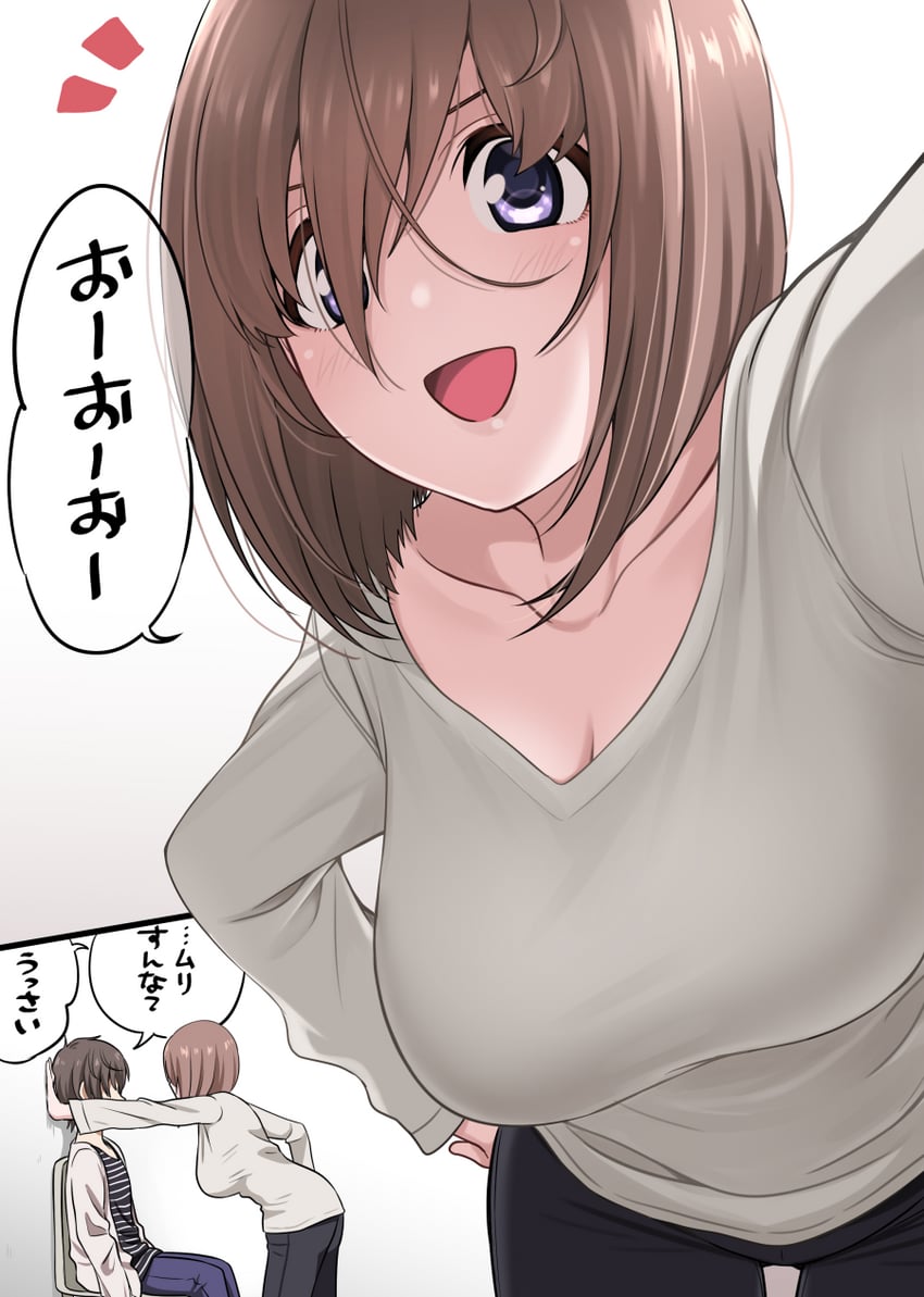 Tags: :d1boyblue pantsblushbreastsbrown haircleavagecovered facefemalefrom sidegrey shirthair over one eyehighresikari manatsuimageboardkabedonkamihira maolarge breastsoriginalpantspurple eyesreachingreaching towards viewerRule34shirtshort hairsmilestandingstripedstriped shirt