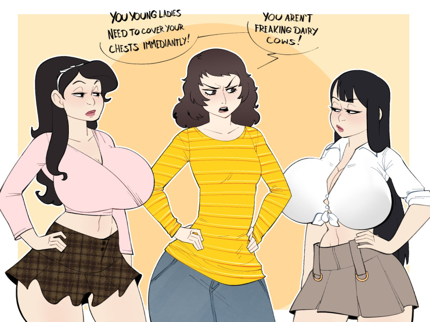 Tags: 3girlsbig breastsblack hairblouseblushbrown hairbursting breastscommissioncommission artdialoguedialogue boxdialougigantic breastshairbandimageboardjeanslong hairmidriffnericurlsoriginal characteroriginal charactersRule34sadayo kawakamishort skirtskirtsmall breastssweaterthick thighsunimpressed