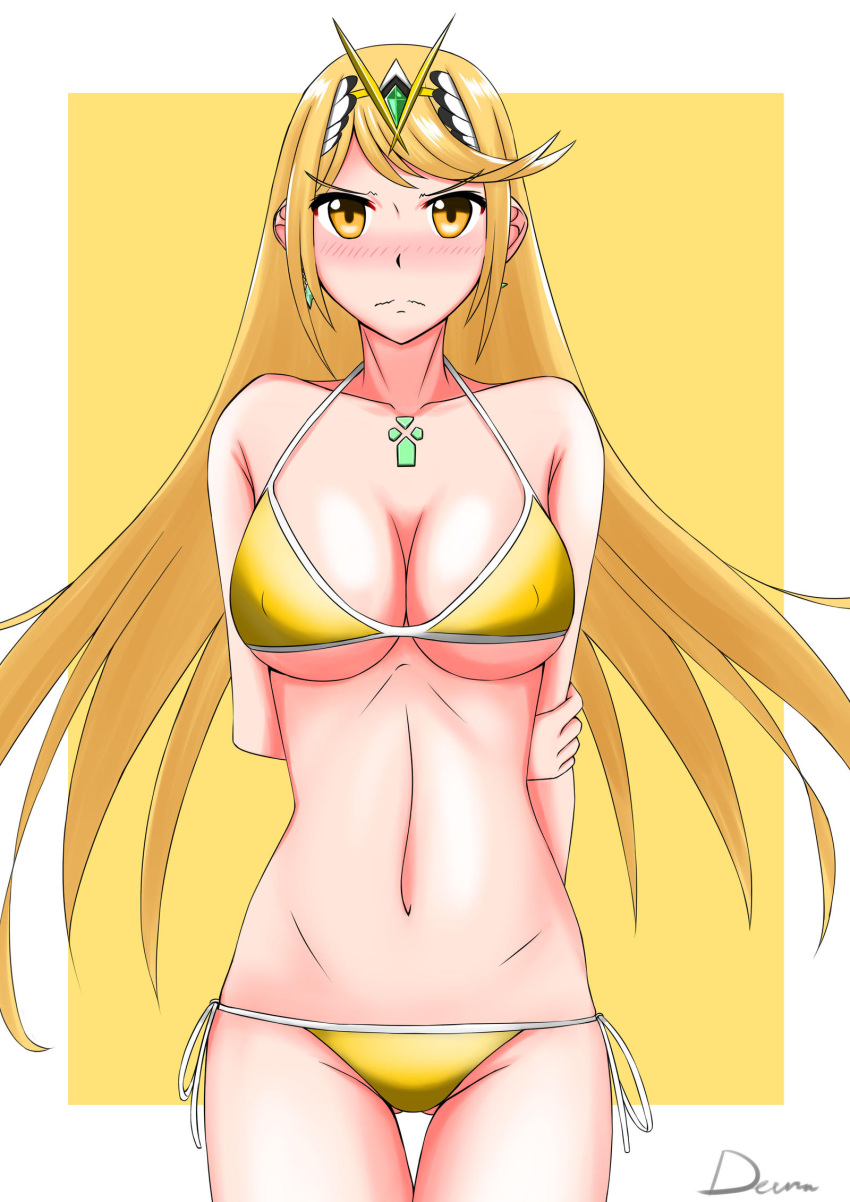 Tags: 1girlsbikiniblonde hairblushbreastscore crystaldiravist00earringsgrabbing own armimageboardlarge breastslong hairlooking at viewermidriffmythranavelnintendoRule34side-tie bikiniside-tie swimsuitswimsuittiaraxenoblade (series)xenoblade chronicles 2yellow bikiniyellow eyesyellow swimsuit