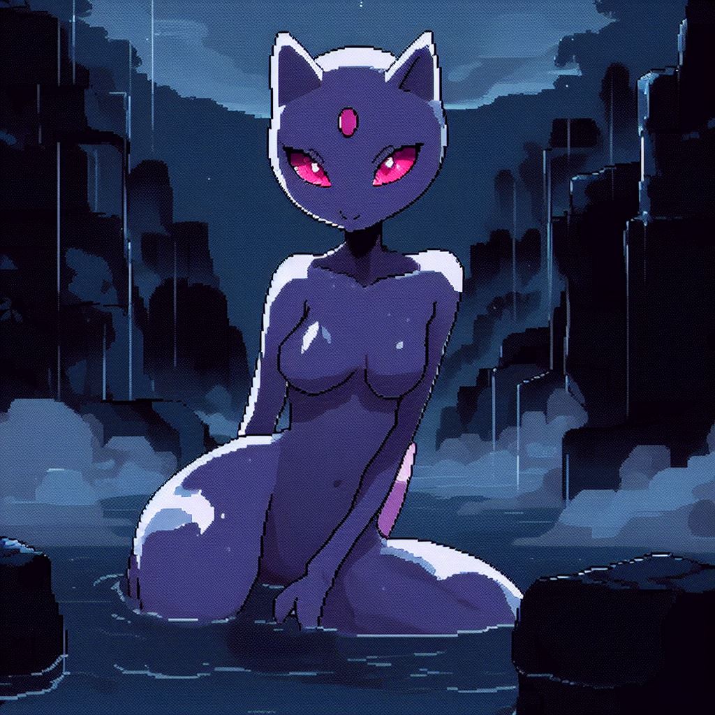 Tags: ai generatedbreastsfeatureless breastsfemalefemale onlyimageboardlooking at viewermewtwonudepixel artpokemonpokemon (species)rainred eyesRule34tagmewaterwet
