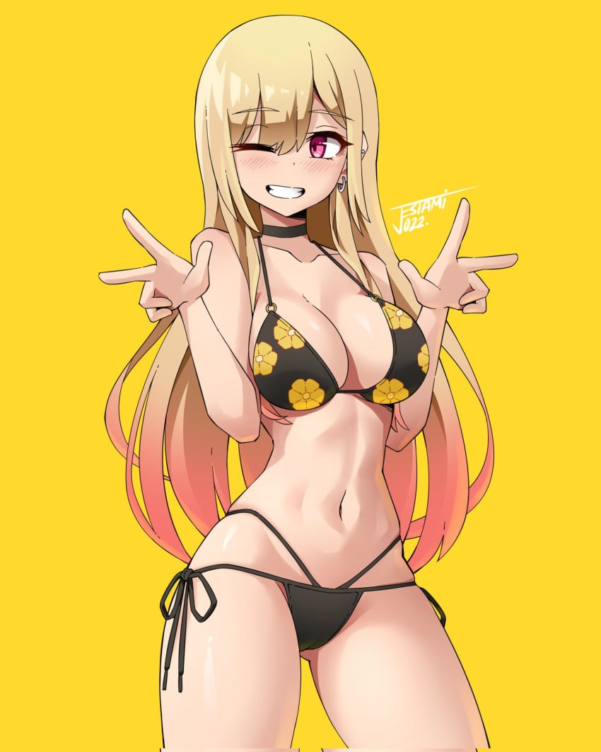 Tags: 1girlsbangsblonde hairblushchokercleavagedouble vearringsfemalehi resimageboardjestamikitagawa marinlong hairnavelone eye closedpink eyesplain backgroundRule34smilesolosono bisque doll wa koi wo suruv signwink