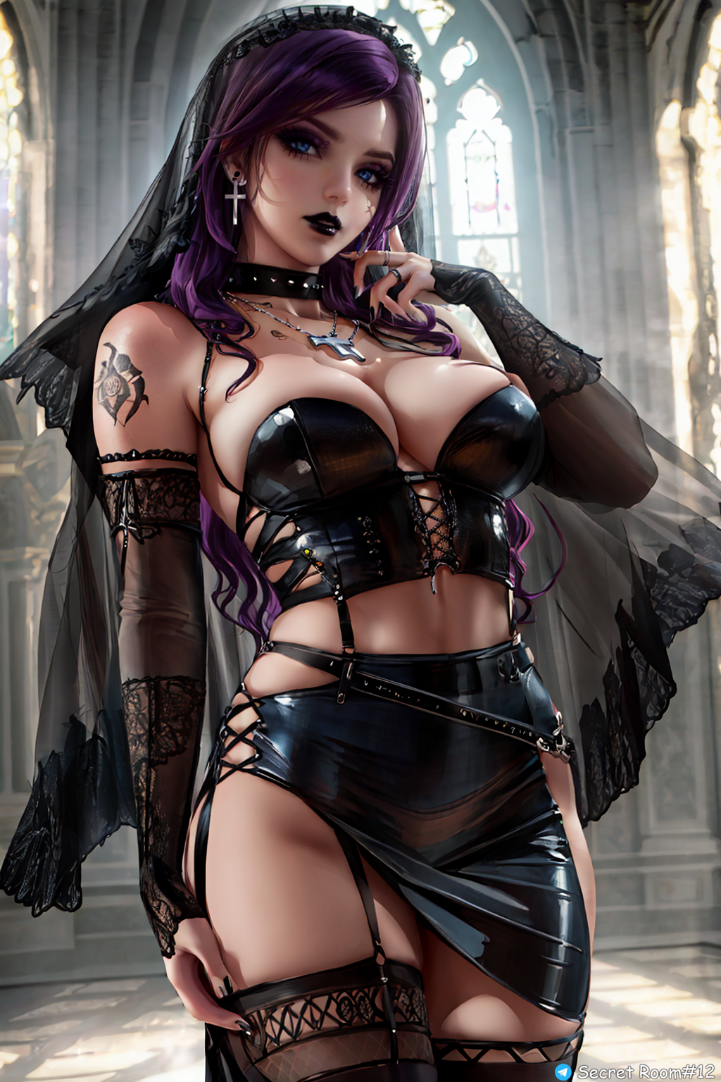 Tags: ai generatedarm warmersarmwearbeltbig breastsblack lipstickblack nailsblue eyesbreastscathedralchokerchurchcrossearringseyeshadowgarter strapsgoth girlimageboardleatherleather clothinglight skinlight-skinned femalemakeupmidriffminiskirtnecklaceoriginal characterpurple hairRule34sakimichan ai artstyle imitationsecret room12stable diffusiontattoothighsveil