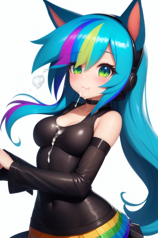 Tags: 1girlsai generatedanimal earsblushcat headphonescumcum in mouthcum on breastscum on faceimageboardlooking at viewermedium breastsrainbow hairRule34sole femaletight clothing