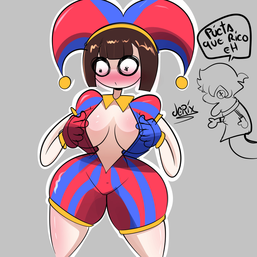 Tags: blushbrown hairfemaleglovesimageboardjerixjester costumejester hatjester outfitlooking downmedium breastspomnirevealing breastsRule34tagmethe amazing digital circus