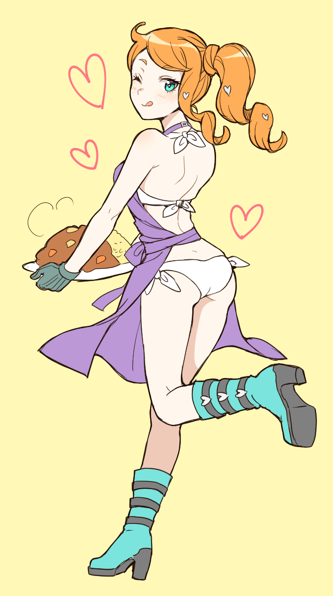Tags: 1girlsapronaqua eyesassbackbootsbracurryfoodfull bodygloveshair ornamentheartheart hair ornamentholding plateimageboardlooking at viewernintendonokataroorange hairpantiesplatepokemonpokemon ssponytailRule34side ponytailsonia (pokemon)standingtonguetongue outyellow background