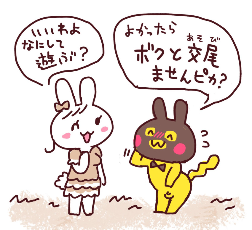 Tags: :3accessoryanthroballsblack bow tieblack maskblushblush linesbottomwearbow accessoryclosed eyesclothed anthroclothed femaleclothingdialogueduofemalefurgenitalshair accessoryhair ribbonhand behind headhi resimageboardjapanese textlagomorphleporidmalemammalmaskmostly nudemostly nude anthromostly nude malenotes translationone eye closedopen mouthopen smilepenisrabbitribbonsRule34scut tailshort tailskirtsmall penissmilespeech bubbletailtexttranslation requestwhite bodywhite earswhite furwhite tailwinkyakoochu1yellow ballsyellow bodyyellow furyellow penisyellow tail