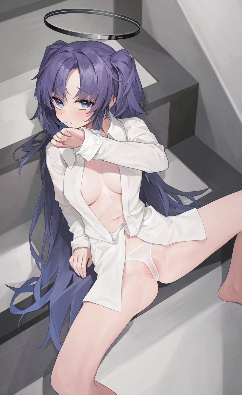 Tags: absurdresarm supportbare legsbarefootblue archiveblue eyesblushbreastsbreasts apartfemalehalohighresimageboardlong hairlooking at viewermedium breastsmillennium science school studentmokewnavelno brano pantspantiespurple hairRule34see-through pantiesseminar (blue archive)shirtsittingsolospread legsstairsstomachsweatdroptwo side upunderwearvery long hairwhite pantieswhite shirtyuuka (blue archive)