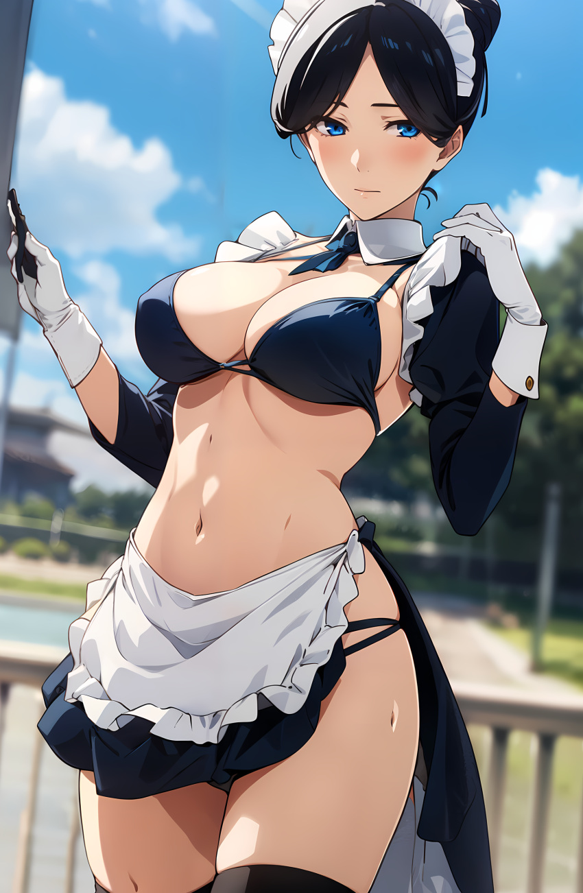 Tags: ai generatedapronartist requestbikiniblack hairbleachblue eyesbreastsfemalegloveshair bunimageboardkatagiri kanaemaidmaid headdressnavelRule34solostable diffusionswimsuitthighhighsunstable diffusionwhite gloves