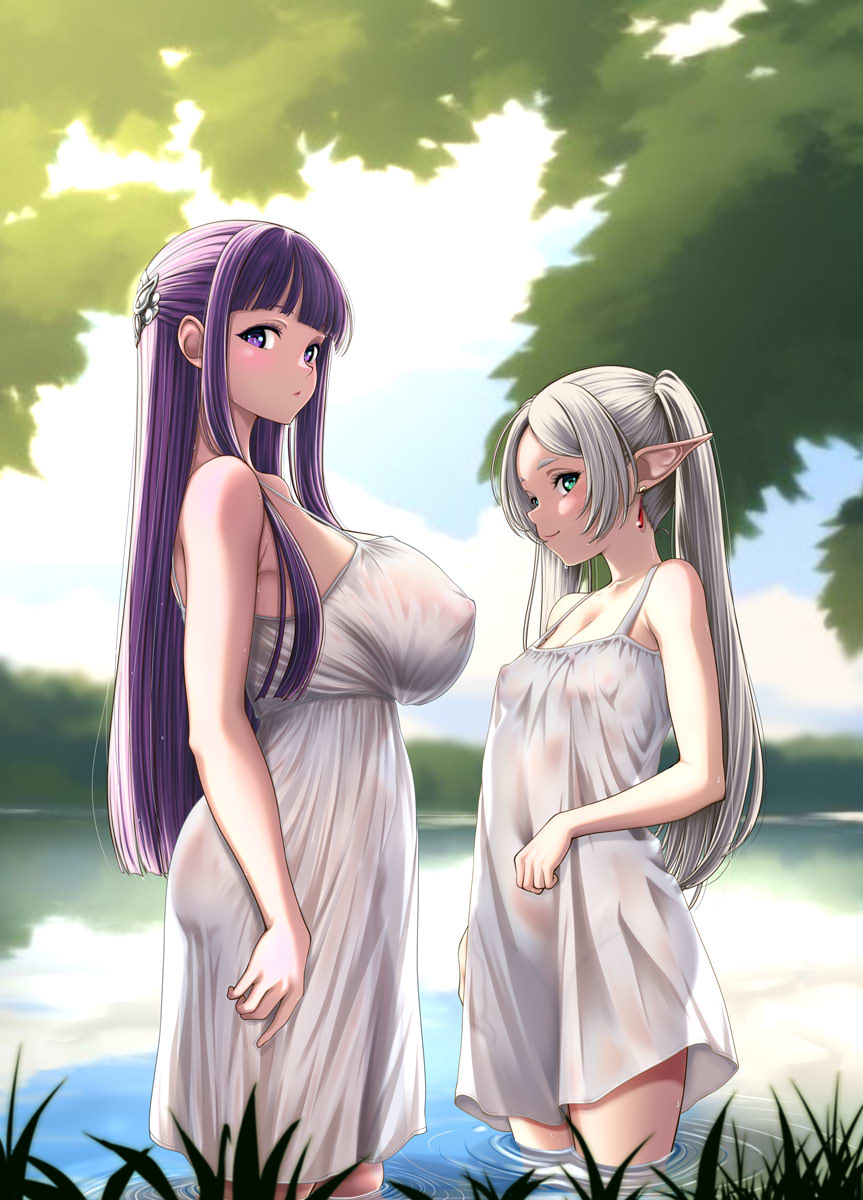 Tags: 2girlsalternate version availablebig breastsbreastsclothingdressfemalefemale onlyfern (sousou no frieren)frierengreen eyeshairhuge breastsimageboardlarge breastslong hairlooking at viewerosuzu akiomipointy earspurple eyespurple hairRule34sideboobsmall breastssousou no frierentwintailswaterwetwet dresswhite dress