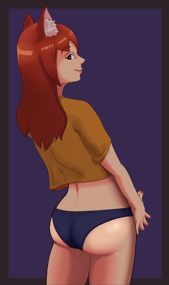 Tags: 1girlsanimal earsassbackback viewbare armsbare backbare thighsbig assblue pantiesfemalefemale onlyfrom behindgigabitgreen eyesimageboardlong hairlooking backnail polishorange hairorange nailsoriginalown hands togetherpantiespurple backgroundRule34shirtshort sleevessimple backgroundsmilesolothighsunderwear