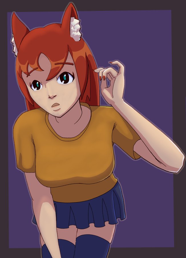 Tags: 1girlsadjusting hairanimal earsbare armsbare thighsbreastsfemalefemale onlygigabitgreen eyesimageboardleaning forwardlong hairmedium breastsnail polishopen mouthorange hairorange nailsoriginalpurple backgroundRule34shirtshort sleevessimple backgroundskirtsolothighhighsthighs