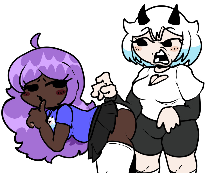 Tags: 2girls4 fingersassblack skirtcleavagecleavage cutoutdark-skinned femalefemale onlyheart cleavage cutoutimageboardlight-skinned femalepanchirapantiespantyshotpurple hairRule34skirtteethwhite hairwhite panties